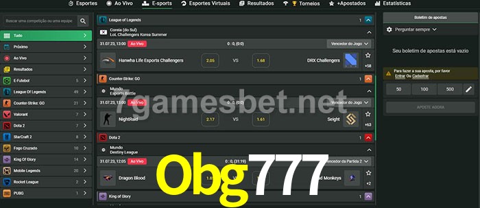 O Obg777 oferece uma grande seleção de opções de apostas em e-sports com probabilidades competitivas